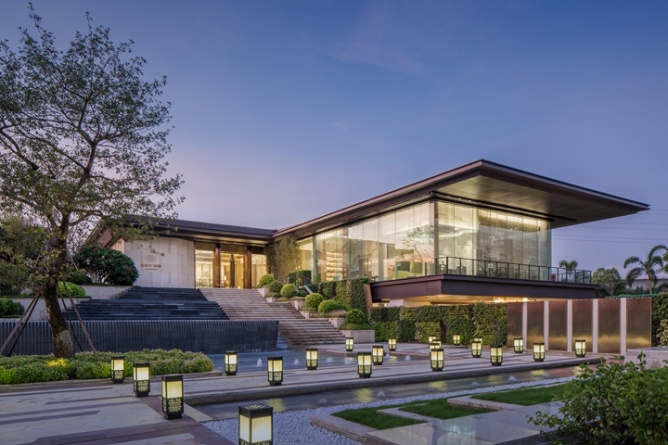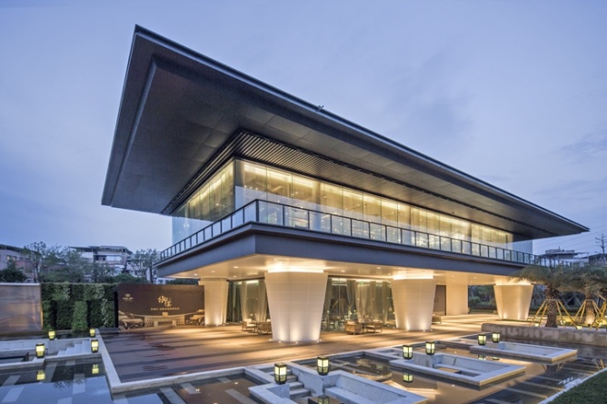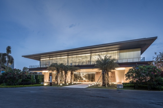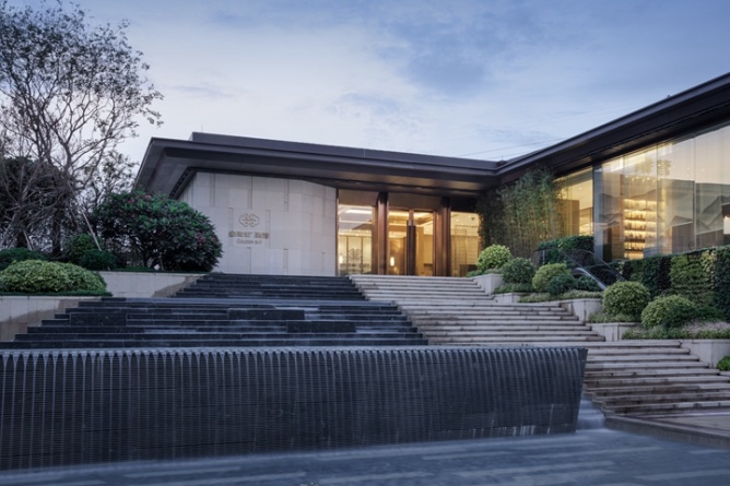 通過(guò)庭院的巨大景觀階梯,伴隨著碧波與春色,步入二層的售樓大廳,一場(chǎng)東方詩(shī)意與唯美的饕餮盛宴就此拉開(kāi)帷幕。5米的層高,結(jié)合著九賓之禮的文化符號(hào),沉穩(wěn)含蓄的木色,精致的海棠角,在最高禮遇下,將場(chǎng)所的文化精神傳遞給每一位賓客。穿過(guò)雕琢精致的金屬屏風(fēng),視野瞬間悠遠(yuǎn)開(kāi)闊,置身沙盤(pán)區(qū),仿佛身處嶺南的群山之中,朦朧間,有光透過(guò),如夢(mèng)似幻。“仁者樂(lè)山,智者樂(lè)水”,中式山水畫(huà)的融入賦予空間優(yōu)雅唯美的東方氣質(zhì)。水吧洽談區(qū)則摒棄了傳統(tǒng)售樓處的功能模式,將中國(guó)的茶文化與整個(gè)銷(xiāo)售洽談區(qū)進(jìn)行了完美的融合,將中國(guó)的傳統(tǒng)文化得到了很好的表達(dá)和傳承。一層則為工法展示及營(yíng)銷(xiāo)人員辦公區(qū),動(dòng)線(xiàn)互不干擾,并利用架空區(qū)域,結(jié)合景觀設(shè)置了賓客休閑活動(dòng)平臺(tái),亦動(dòng)亦靜,濃淡相宜。